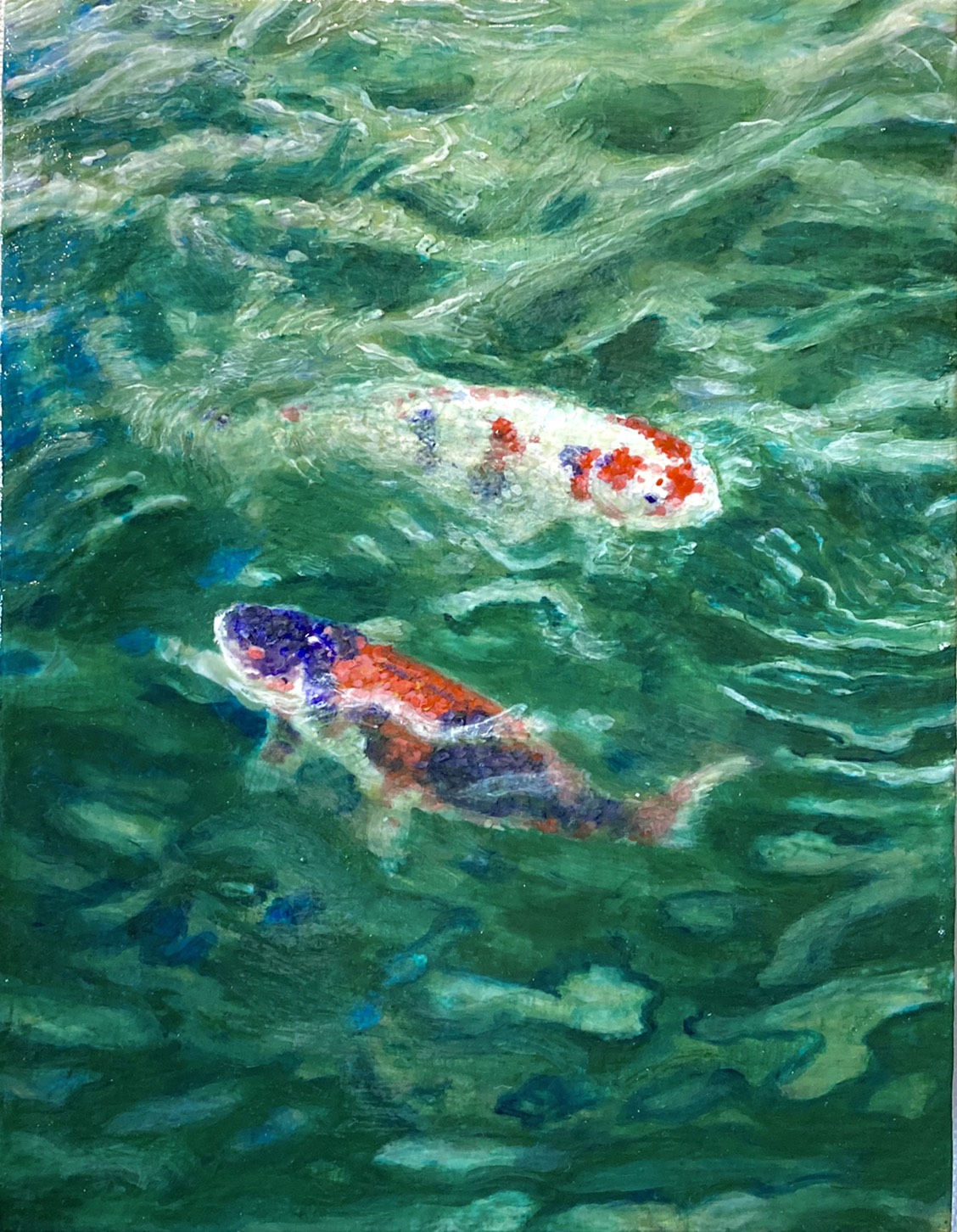 こちらは部員による個人作品です。昨年から引き続きオンラインでの部活動が主で、現在も部室の使用には人数などの制限が設けられています。そんな中で製作された作品は、水彩や油彩に加え、自宅でも扱いやすいアクリルや、映像など多様な手法が用いられています。どうぞお楽しみください。